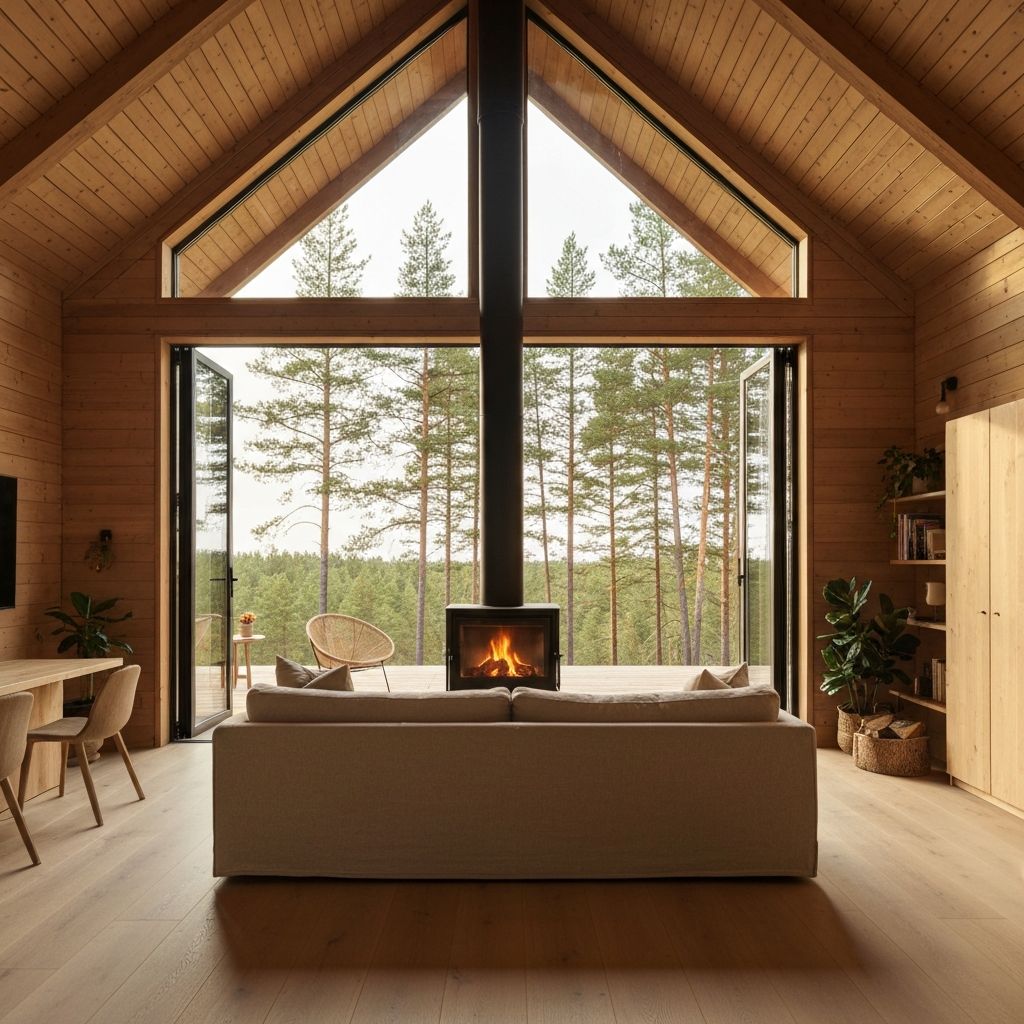 От уютных A-frame для двоих до семейных лофтов на 8 человек. Все домики из натурального дерева, с панорамными окнами и видом на лес.